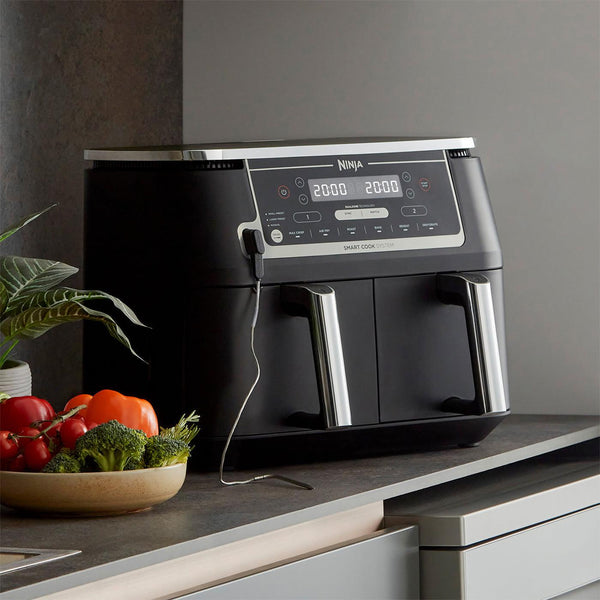 The large capacity air fryer that cooks 2 foods, 2 ways, and finishes at the same time - with perfect results. Mix and match cooking functions, cook times and temperatures across 2 drawers to create delicious meals. Both zones are ready to serve at the same time with the Sync setting. Enjoy perfectly cooked meat and fish with no guesswork – simply choose your food type and desired finish, from rare to well done, and let the Smart Cook System do all the work. The Digital Cooking probe precisely monitors your food's temperature as it cooks.